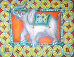 2008Dit doek van een 'Geluksolifant' is geschilderd in opdracht. Rondom de olifant staan wensen voor een goed, gezond en gelukkig leven.