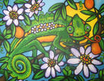 2008Dit doek van een kameleon in een passiestruik is geschilderd in opdracht van iemand die op een keerpunt in zijn leven stond.